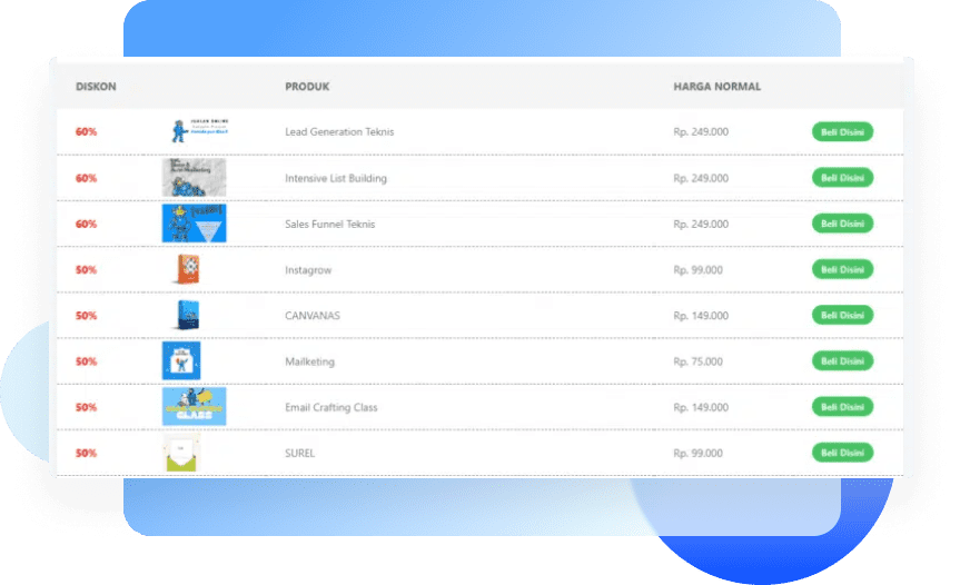 Kami menawarkan berbagai produk dengan harga khusus member, termasuk diskon hingga 60%. Dengan harga khusus ini, Anda bisa mendapatkan produk dengan harga yang lebih murah, baik untuk kebutuhan sendiri, dijual kembali, ataupun sebagai bahan review sebelum menjual.