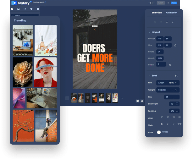 Restory menawarkan berbagai fitur termasuk editor Drag & Drop, Global Library, dan Images, video, Gif, untuk membantu Anda membuat stories yang berkualitas tinggi yang akan menarik perhatian audiens Anda.