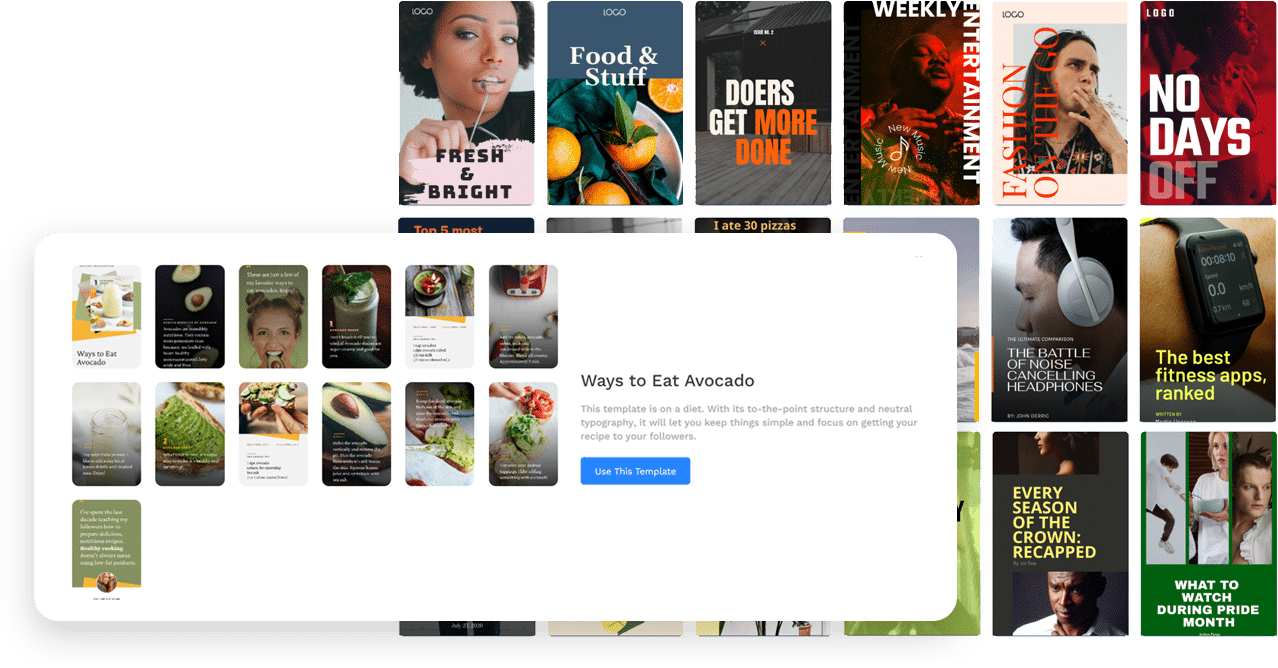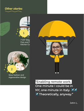 Anda dapat dengan mudah membuat dan menyesuaikan stories dengan editor drag-and-drop kami, dan memilih dari berbagai template, stiker, bentuk, dan lainnya untuk menambahkan sedikit gaya pada cerita Anda.