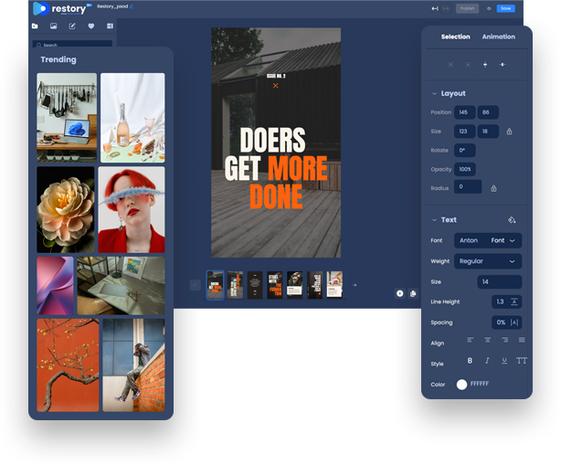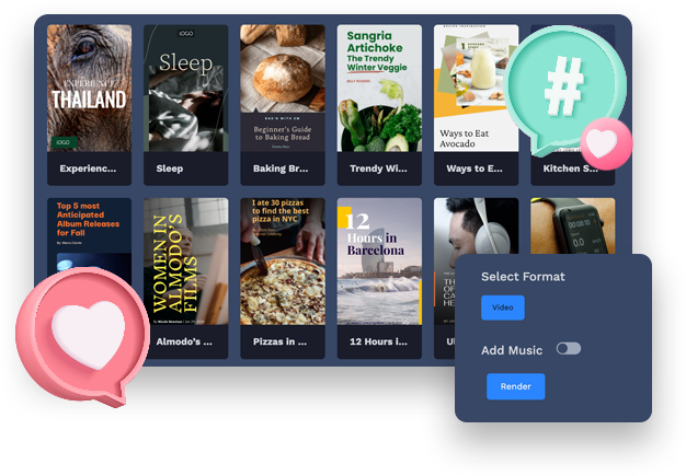 Aplikasi kami dirancang untuk membantu Anda membuat berbagai cerita visual untuk media sosial, termasuk grafik, video, dan animasi. Apakah Anda ingin membuat cerita yang terlihat profesional atau sesuatu yang lebih menyenangkan, alat kami memiliki semua yang Anda butuhkan untuk membuat video menakjubkan yang akan memikat audiens Anda.