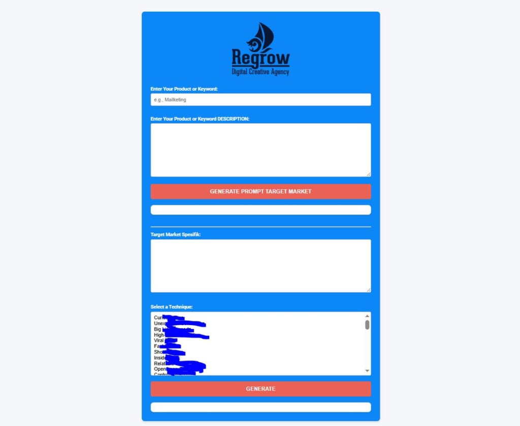 Langkah 3: Pilih Target Audience yang ingin kamu incar, input ke tools, pilih teknik Copywriting High Enagegement yang kamu mau. dan generate prompt.