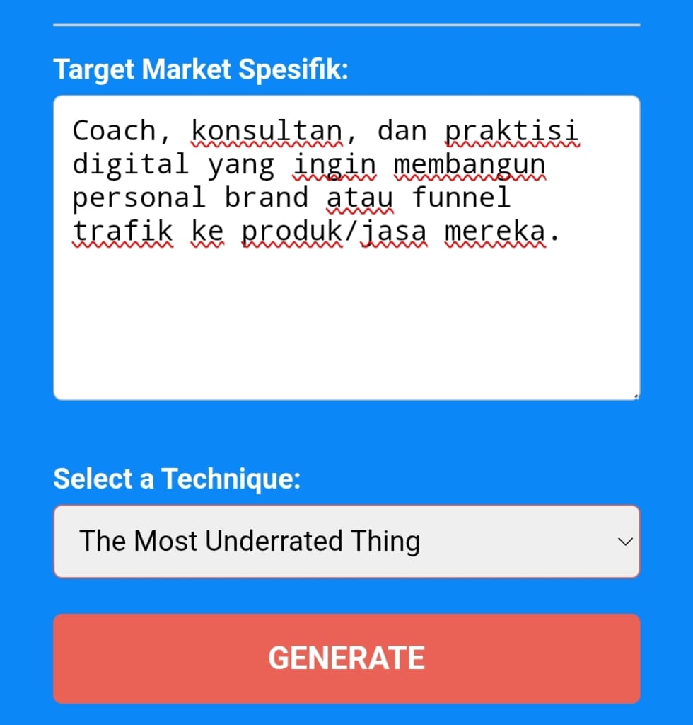 Tinggal input niche dan target market, kamu dapat daftar audiens potensial & sudut konten yang bisa langsung dieksekusi.