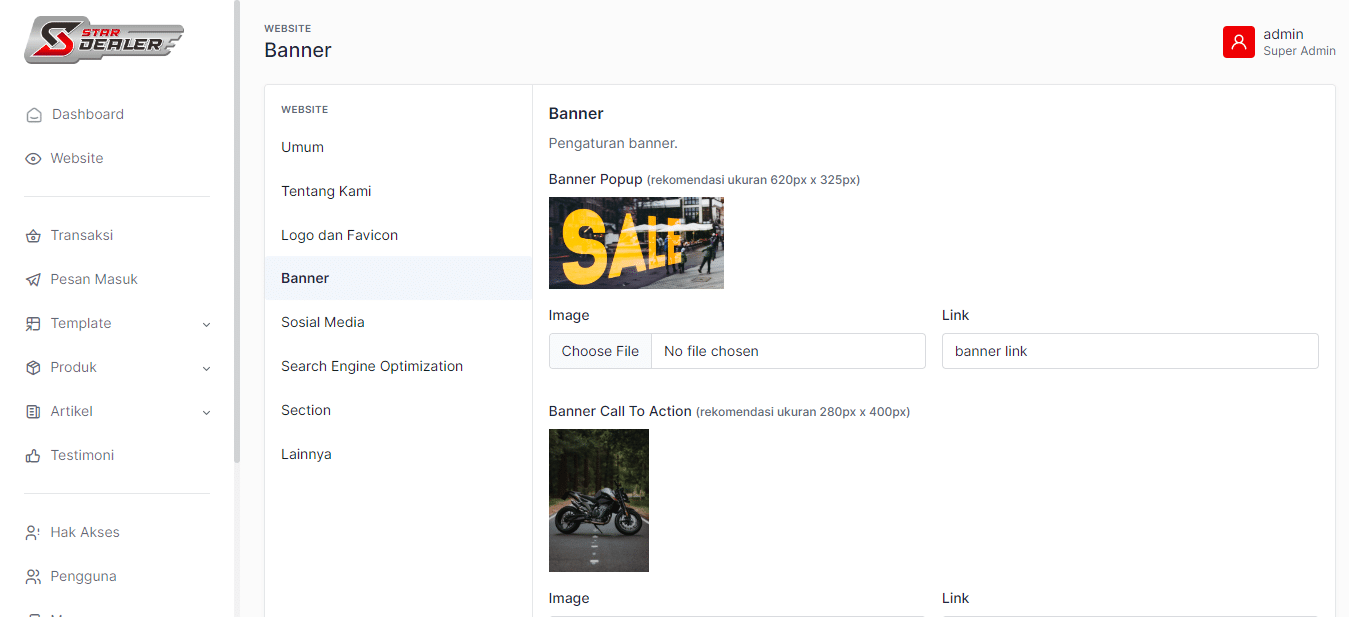 Menu untuk menambahkan gambar banner yang menampilkan produk atau promo, seperti popup atau gambar live chat support.