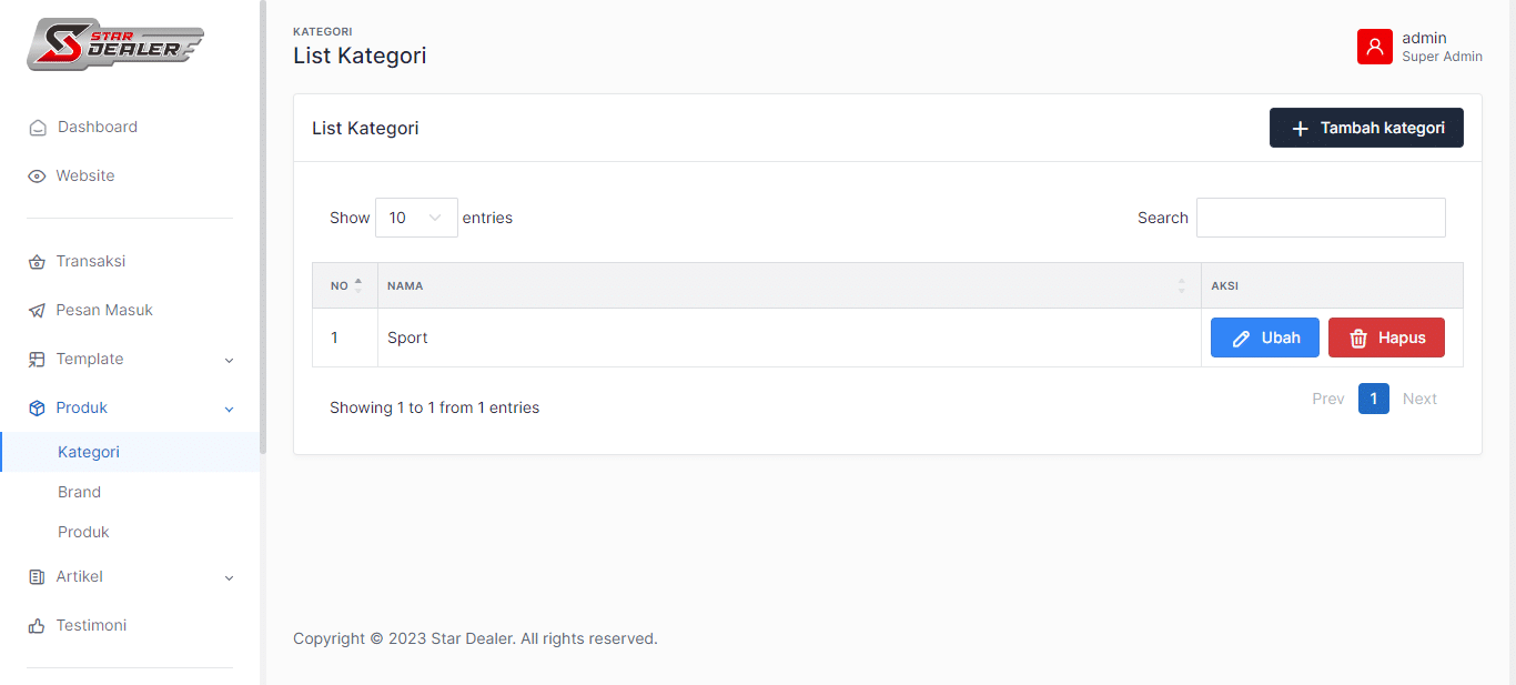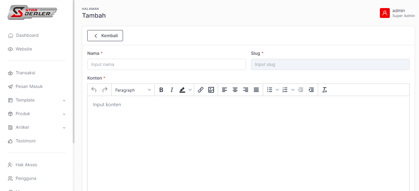 Menu untuk menambahkan produk baru ke dalam website dealer, termasuk informasi spesifikasi, kategori, brand, dan harga produk.