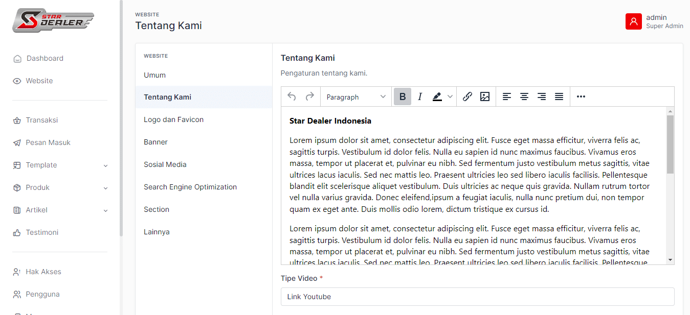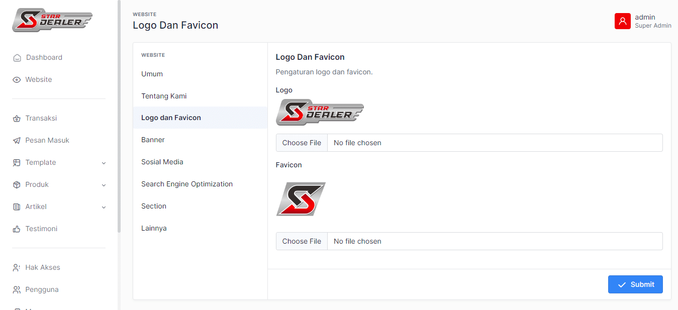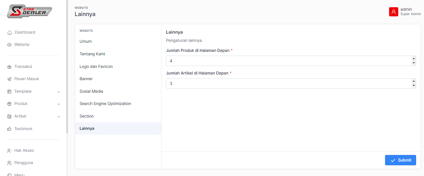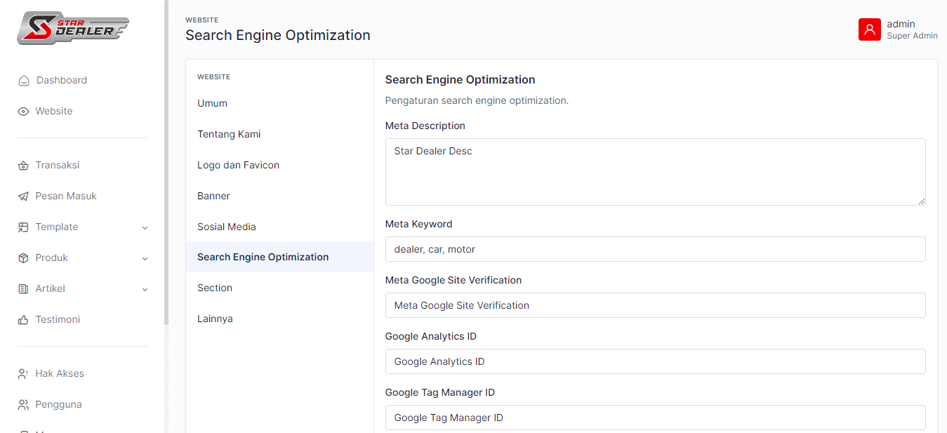 Menu untuk mengatur pengaturan SEO pada website dealer untuk meningkatkan rangking pada mesin pencari.