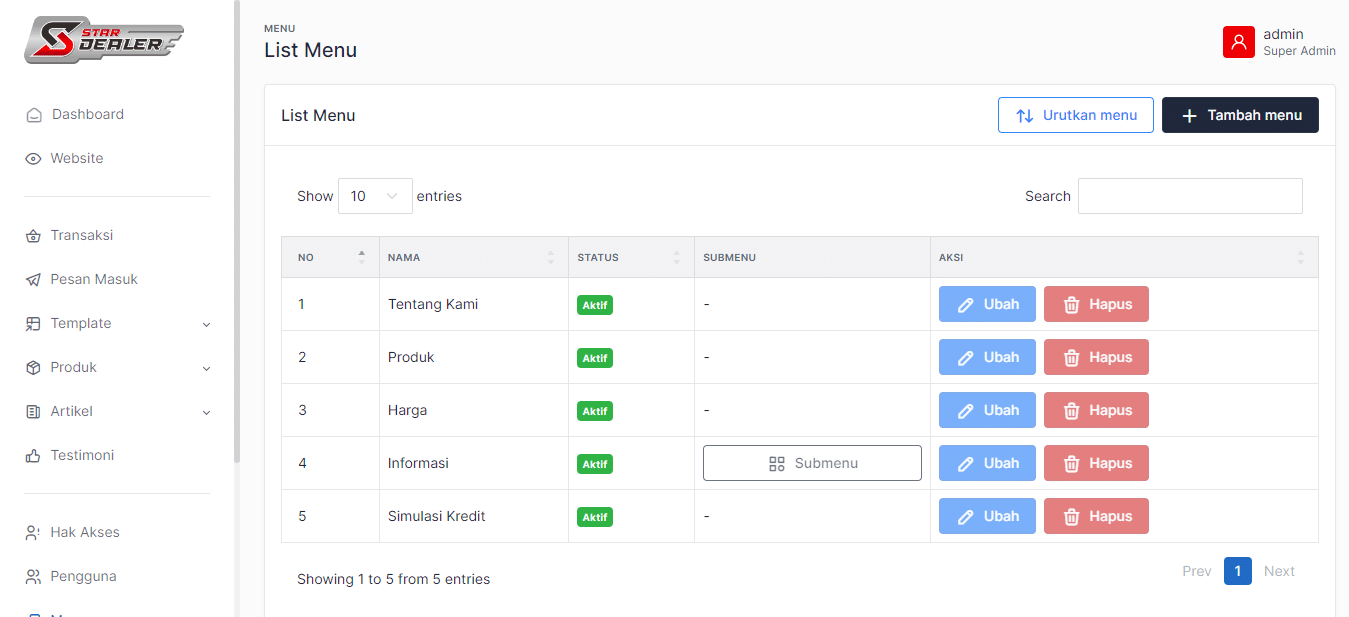 Menu untuk menyesuaikan tampilan menu utama pada website dealer.