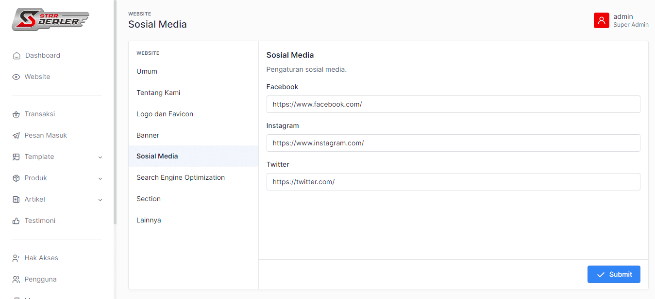 Menu untuk mengatur tautan ke halaman sosial media perusahaan seperti Facebook, Instagram, dan lain-lain.
