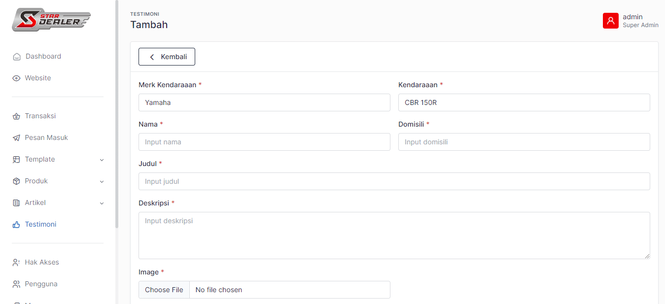 Menu untuk menambahkan testimoni atau ulasan dari pelanggan yang telah membeli produk dari website dealer.