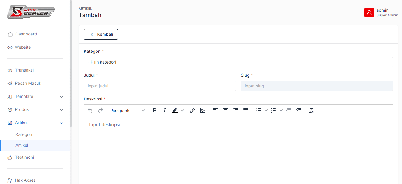 Menu untuk menambahkan artikel atau konten yang terkait dengan mobil, misalnya tips perawatan, review mobil, dan lain-lain.