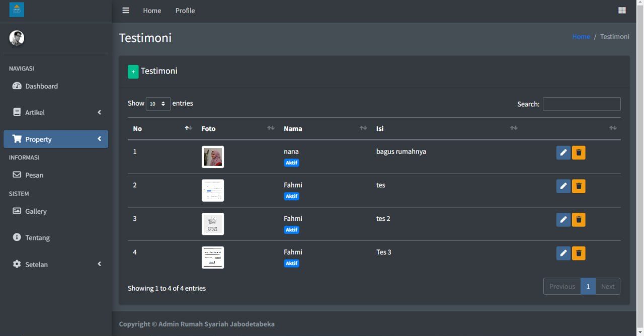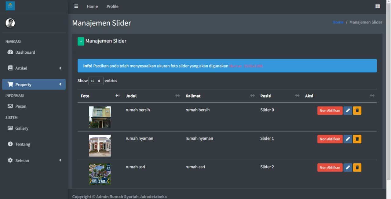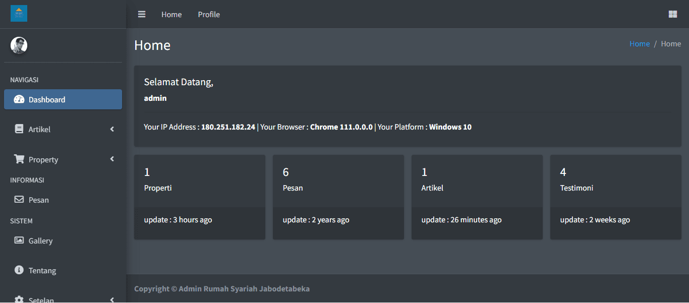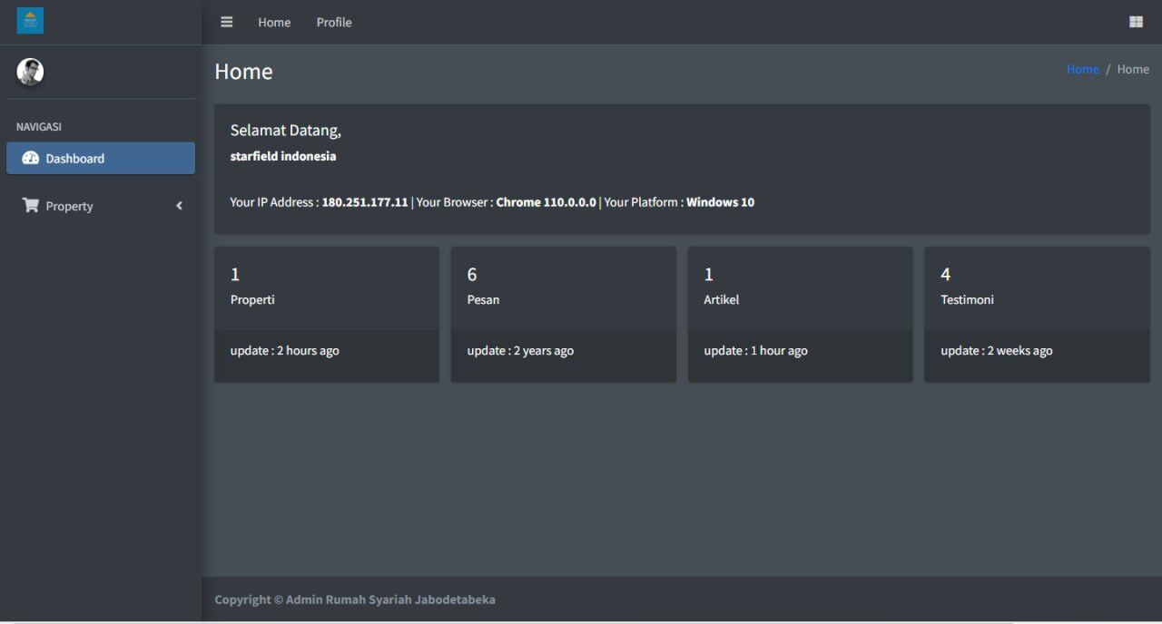 Starproperty menyediakan halaman dashboard yang memudahkan pengguna untuk memantau jumlah properti, pesan, artikel, dan testimonial yang ada di website mereka. Hal ini dapat membantu pengguna untuk mengevaluasi kinerja website mereka dan mengambil tindakan yang tepat untuk meningkatkan kinerja website.