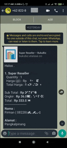 Customer tinggal pilih produknya, isi data, terus checkout, langsung deh terhubung ke CS di WhatsApp, sudah lengkap sama totalan + ongkirnya.