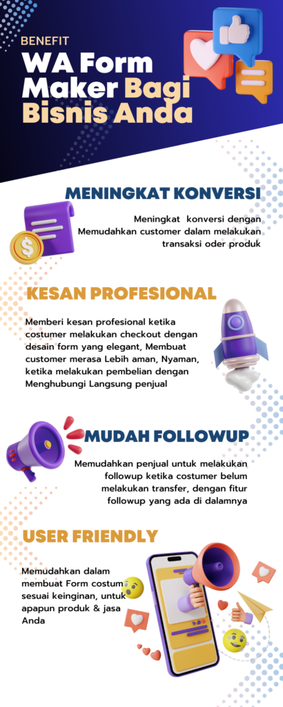 WA Form Maker adalah sebuah plugin wordpress yang berfungsi untuk membuat form order costum sesuai kebutuhan Anda, yang bisa terhubung langsung dengan aplikasi whatsap. Dilengkapi dengan berbagai fitur yang akan sangat membantu pertumbuhan bisnis Anda